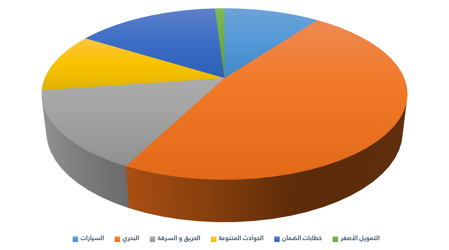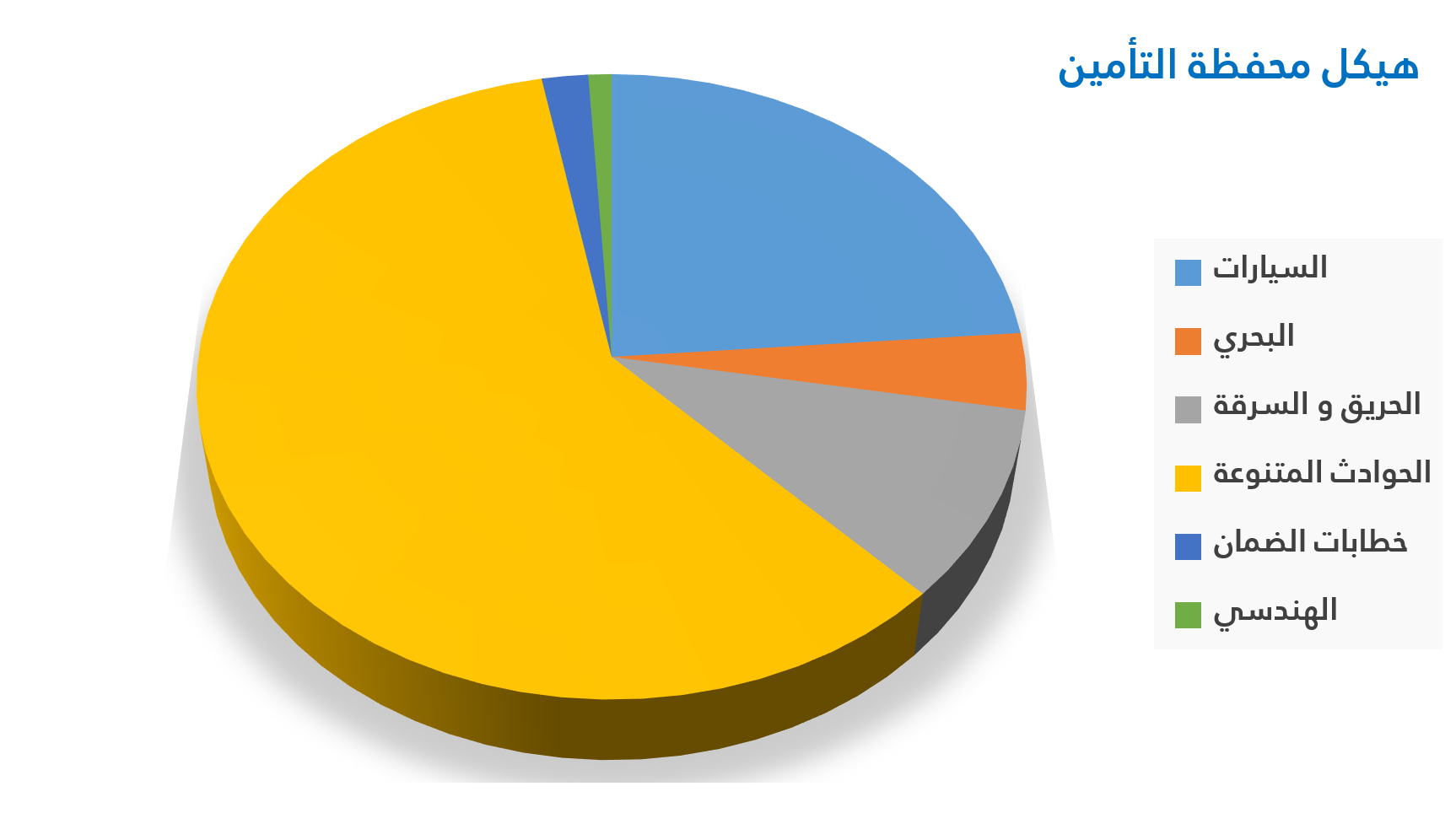 تميزت المحفظة التأمينية بتنوع جيد خلال العام 2022م حيث كانت أعلي نسبة إكتتاب أقساط تأمين الحوادث المتنوعة بنسبة %60 يليه إكتتاب تأمين السيارات %23.7 ثم تأمين الحريق والسرقة %9.8